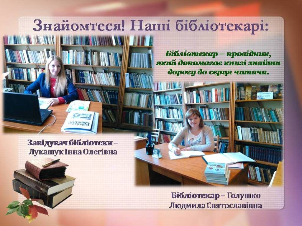 У цей день у нас є особлива нагода згадати і подякувати за клопіткупрацю та високу місію нашим бібліотекарям, адже вони виховують грамотногочитача, вчать його орієнтуватися у потоці інформації, уміло користуватисяресурсами та послугами бібліотеки. Їм відомі секрети класифікації книг,складання бібліографічних описів та каталогів.