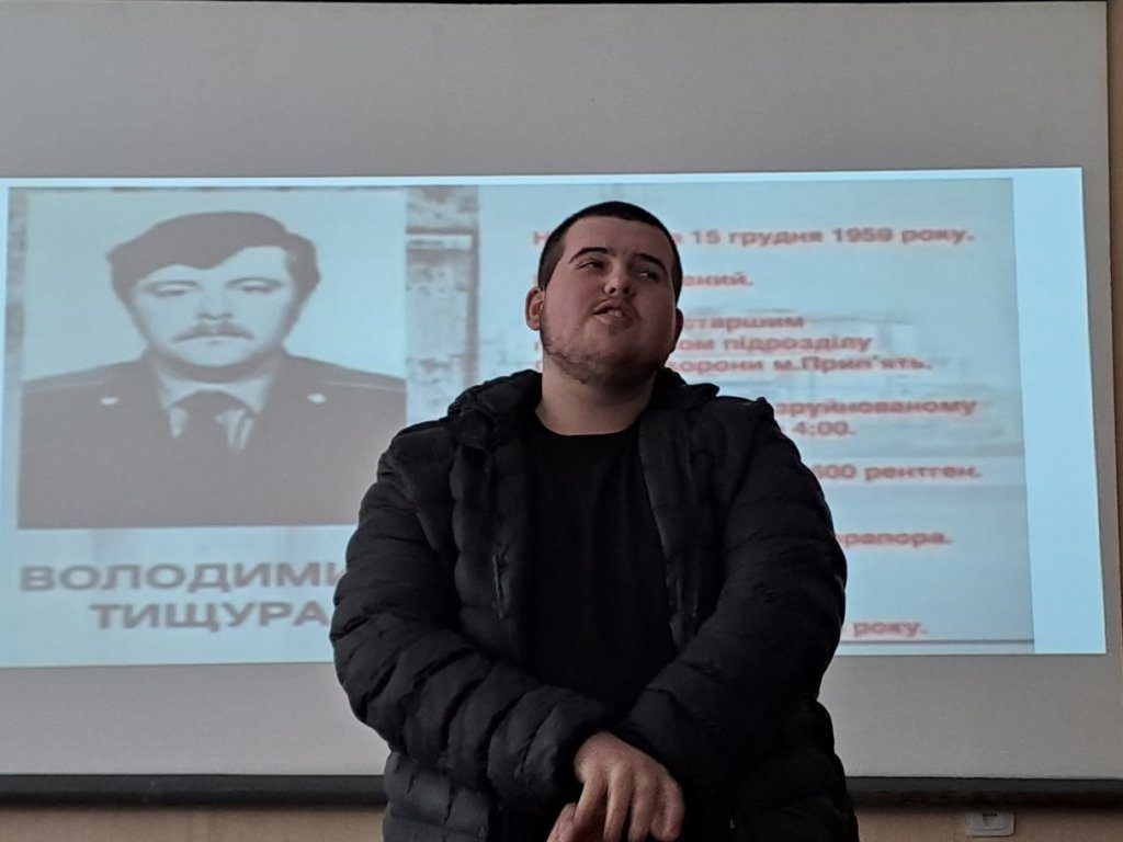 Саме про цю страшну дату та її наслідки для українців 5квітня 2023 року говорили студенти групи ІІІ спецвет разом з куратором ВасилемВікторовичем Прусом під час відкритої виховної години-спогаду «Чорнобиль:чорний спомин і вічний біль». Усі присутні мали змогу осмислити масштаби трагічнихподій і скласти шану людям, які, ризикуючи власним життям і здоров’ям, рятувалисвіт відподальшого поширення радіації. Чорнобиль – чорний біль нашоїземлі. І скільки б не минуло років, все одно це слово полум’янітиме чорнимвогнищем скорботи. Чорнобильська аварія стала для нас уроком, за який заплаченодорогою ціною. Пам’ятаймо!