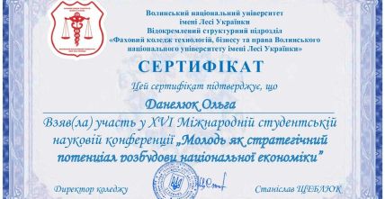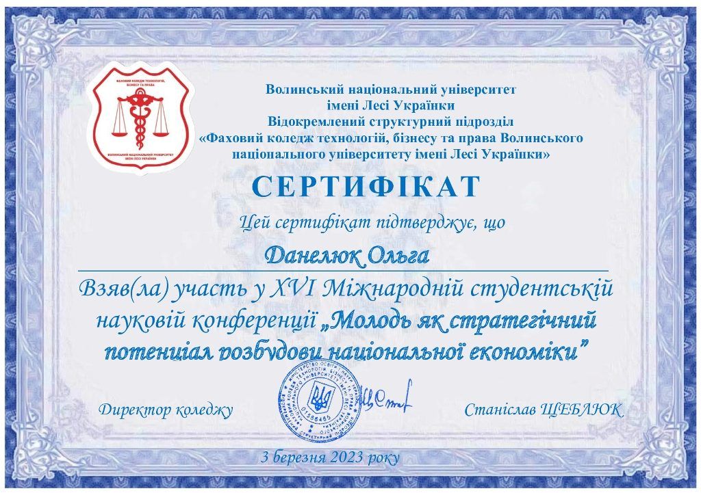3 березня 2023 року у ВСП“Фаховий коледж технологій, бізнесу та права Волинського національногоуніверситету імені Лесі Українки” проходила ХVІ Міжнародна студентська наукова конференція “Молодь як стратегічний потенціал розбудовинаціональної економіки”. До участі були запрошені здобувачі освіти закладіввищої, фахової передвищої, професійної (професійно-технічної) та позашкільноїосвіти України і зарубіжжя.