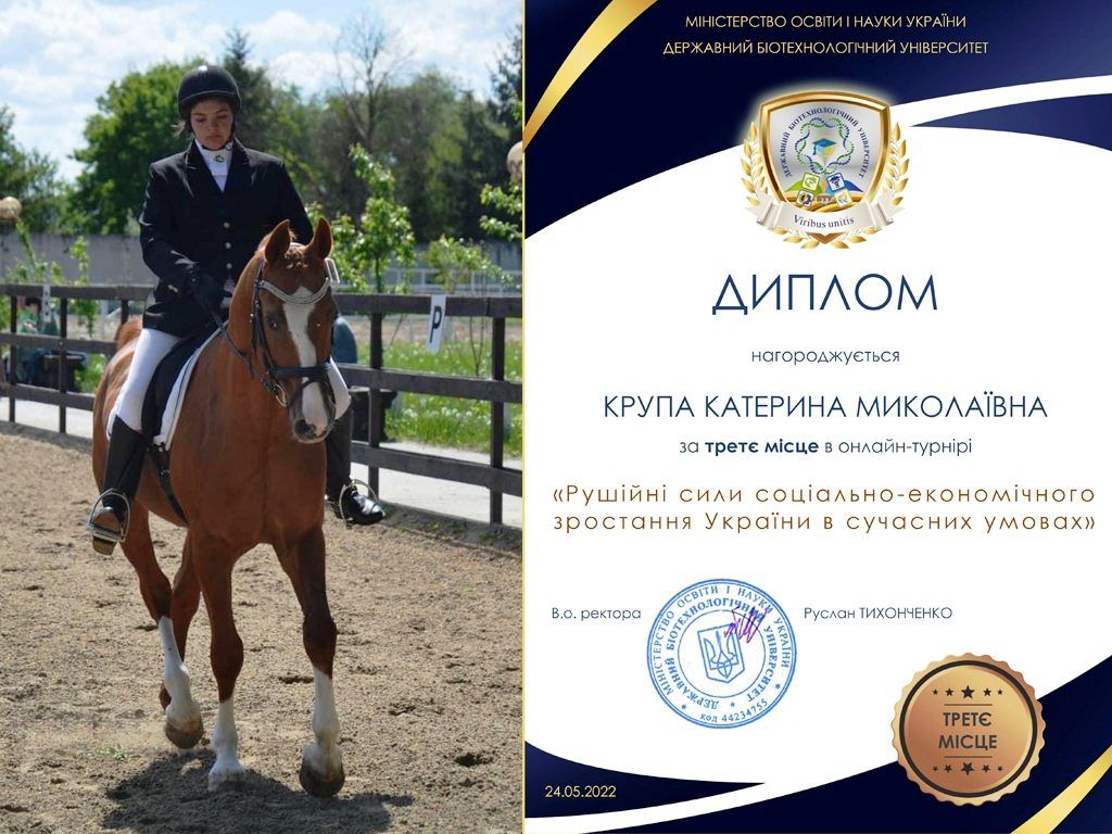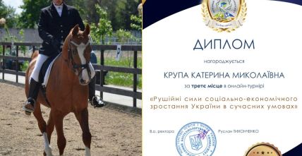 –Дипломом за третє місце нагороджені: студентка групи ІІ вет Катерина Крупа(секція «Іппотерапія та кінний спорт», керівник – Інна Євгеніївна Петрук) тастудент групи ІІ спецвет Назар Каган (секція «Виведення різних порід собак таїх характерні особливості», керівник – Олена Йосипівна Заяць).Щиро вітаємо переможців і їх керівників та бажаємоїм чергових успіхів! Ми впевнені, що досвід участі в даному турнірі усіх багаточому навчив. Ніколи не зупиняйтеся на досягнутому – вчіться, дізнавайтеся нове,розвивайтеся!