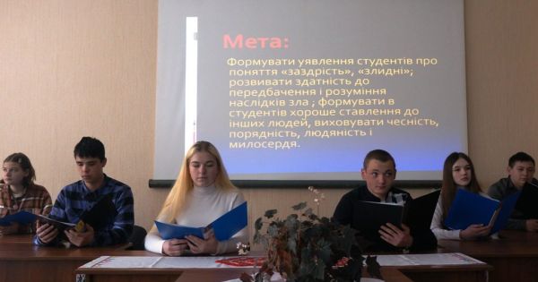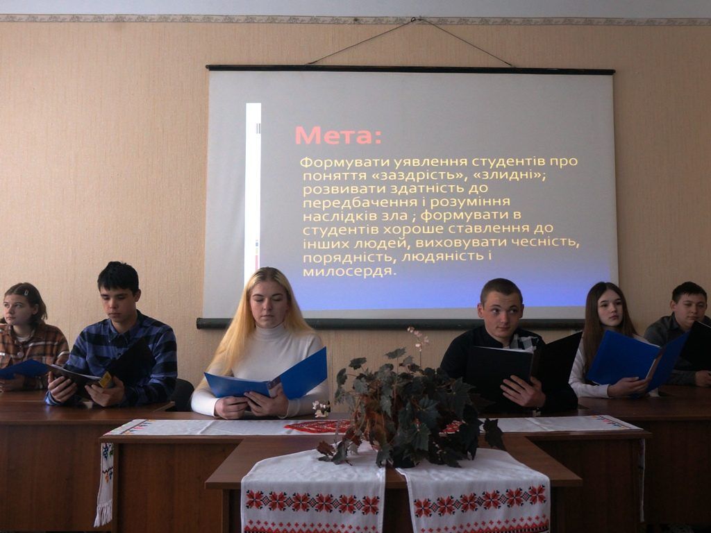 Метавиховної години: формувати уявлення студентів про поняття «заздрість»,«злидні»; розвивати здатність до передбачення і розуміння наслідків зла; формуватиу студентів хороше ставлення до інших людей, толерантне ставлення до сусідів; виховуватиу здобувачів освіти чесність, порядність, людяність і милосердя.