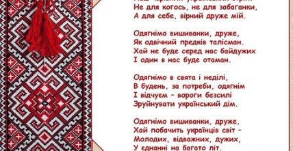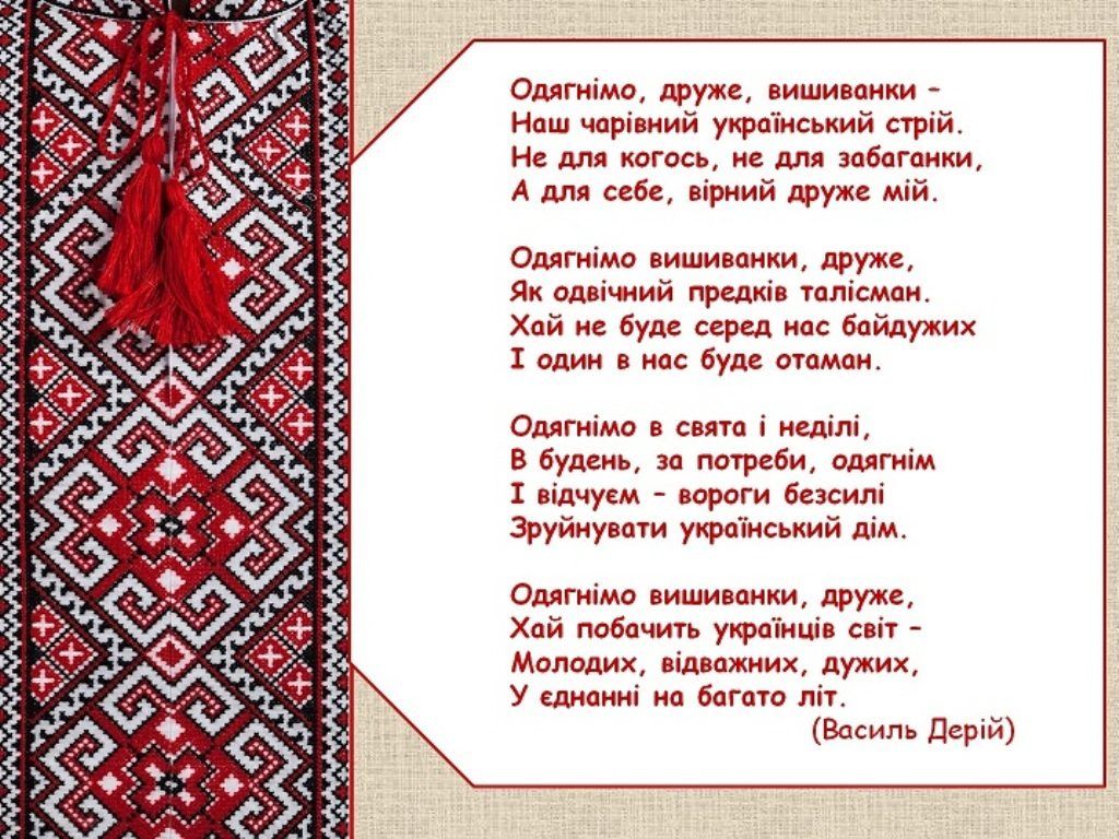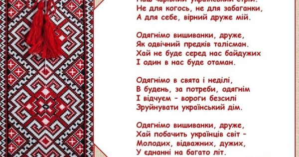 Споконвіку для українців вишиванка була наче оберегом, тому й сталасправді дорогоцінною. Кожен птах, кожна квітка, що прикрашає вишиту сорочку,має своє символічне значення, спрямоване на добре та щасливе життя.Бажаємо,щоб українська вишиванка щодня охороняла Вас, щоб благословляла на щасливежиття, на служіння Україні.